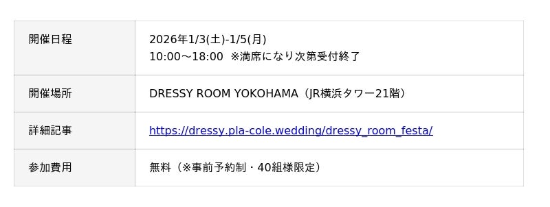 「PLACOLE & DRESSY」ブランドを展開する冒険社プラコレ(本社:神奈川県鎌倉市、代表取締役CEO:武藤功樹)は、横浜駅直結JR横浜タワー21F、ウェディングの魔法にかかる空間"DRESSY ROOM YOKOHAMA"にて、1/3(土)~1/5(月)の3日間限定で、これから結婚式をお考えのカップル様に向けた、個室相談やウェディングドレス試着ができる豪華特典付きのウェディング初体験フェスを開催いたします。(40組様限定、無料開催)