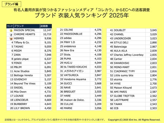 OMO(Online Merges with Offline)ソリューションを手掛けるアイエント株式会社(本社:東京都渋谷区神宮前、代表取締役 大森智人)は、ファッションに特化したEC支援やPRプラットフォームを開発・運営しており、自社サービス「コレカウ(有名人の着用衣装が見つかるファッションメディア)」のデータをもとに、2025年にテレビやSNSで注目を集めたタレント・番組・ブランドのファッション人気ランキングを発表しました。