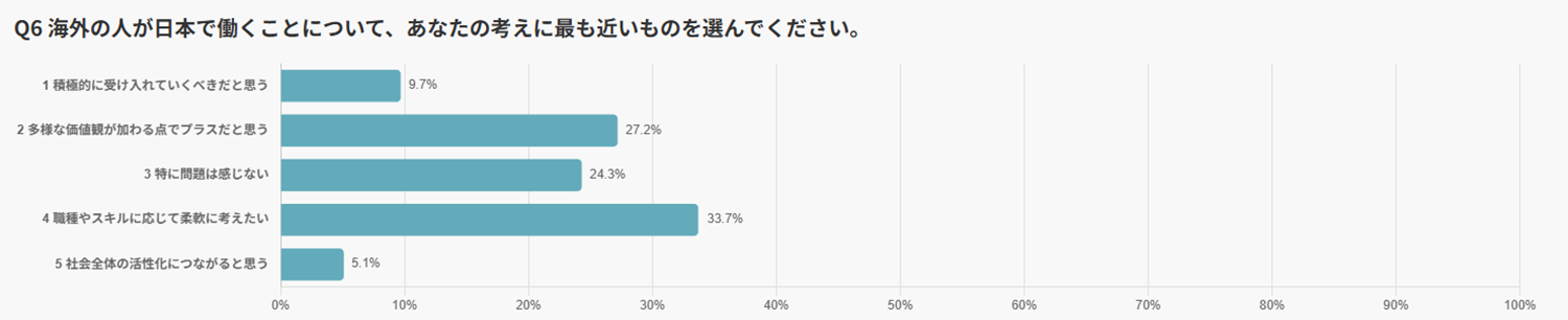 これらの結果から、海外の人が日本で働くことについては、歓迎か拒否かではなく、条件や役割を重視した現実的な受け止め方が中心であることが分かります。