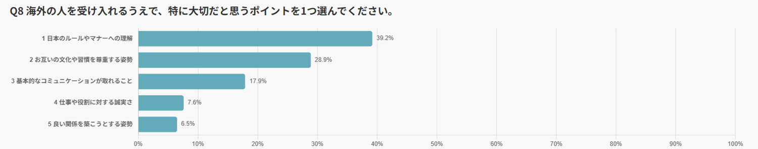 これらの結果から、海外の人を受け入れるうえでは、感情的な好意よりも、ルール理解と相互尊重を土台とした関係づくりが重要視されていることが分かります。