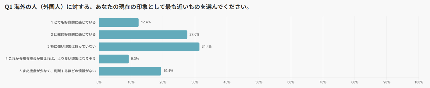 特に、「特に強い印象は持っていない」や「判断するほどの情報がない」という回答の多さは、海外の人に否定的というよりも、十分な接点や情報をまだ持っていない状態を反映している可能性があります。