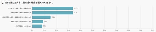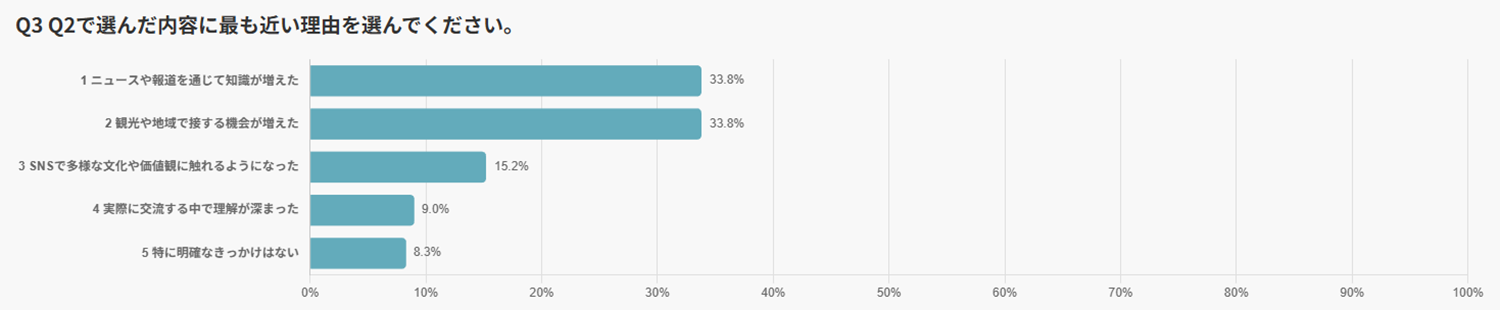 最も多かったのは、「ニュースや報道を通じて知識が増えた」と「観光や地域で接する機会が増えた」で、いずれも33.8%でした。