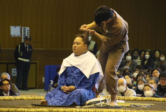 「床山」と呼ばれる力士の髷を結う職人が、翠富士関に大銀杏を結う様子を実演しました。