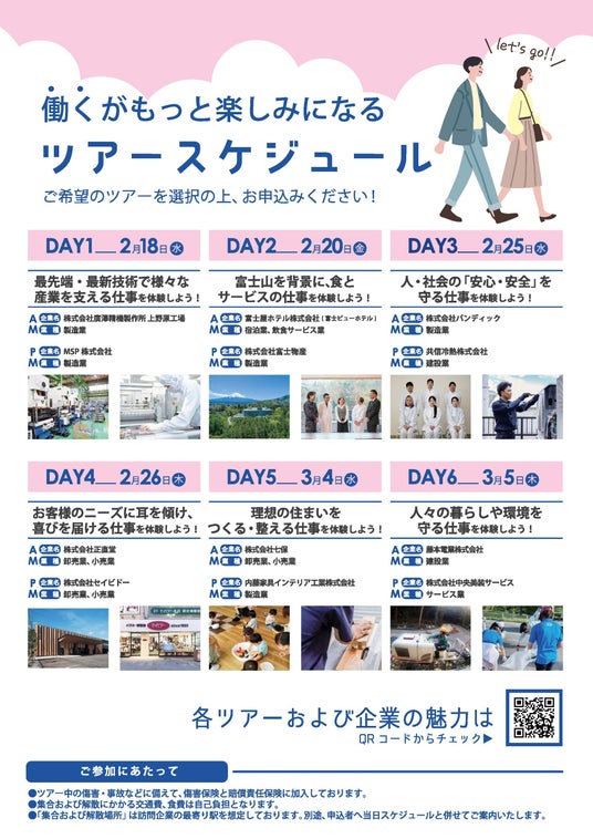この度、企業と学生のマッチングの場として「やまなしプチ就業体験・企業見学ツアー」を開催します。本ツアーでは、県内企業を1日で複数訪問し、働く人の想いや現場の様子を体感できます。企業との調整や送迎は事務局がサポートするため、安心して参加でき、就職活動前の業界研究やキャリア形成に役立つ有意義な機会となります。