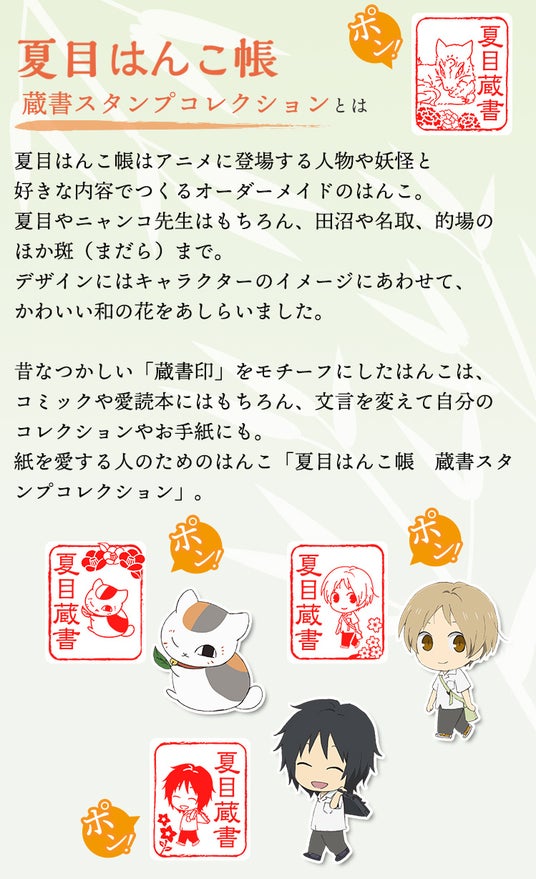 「夏目はんこ帳 蔵書スタンプコレクション」は、コミックや愛読本などをかわいく彩る、本を愛する人のためのはんこを作りたいという想いから、昔ながらの蔵書印をモチーフに企画したはんこです。