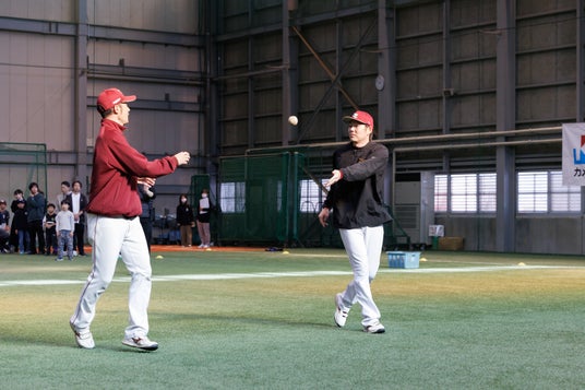 親子に野球を教えたのは、楽天イーグルスアカデミーの森山周コーチと塩見貴洋コーチです。