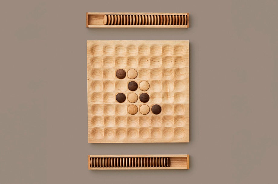 クラフトマンシップと機械加工の特性を生かした作品が特徴の<SASAKI>。北海道産のカバ材を使用し、木目や質感を生かしながら職人の手で丁寧に磨き上げた、木製のリバーシです。