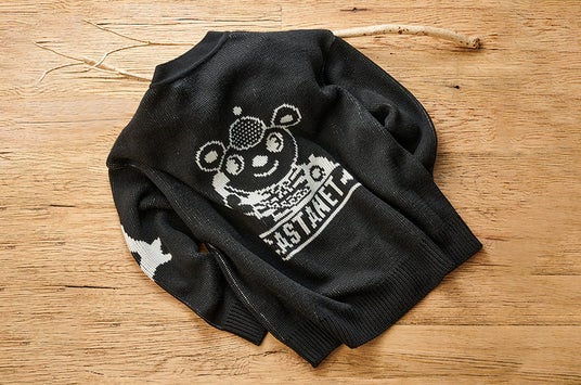北海道発オリジナルキャラクターのクマの「カスタネットちゃん」が背中にデザインされた、ジャカード編みのニットカーディガン。左腕部分の北海道の形のマークがワンポイントに。