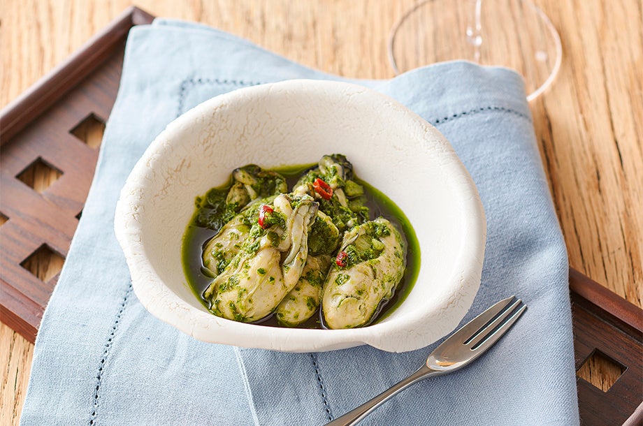 プリプリの牡蠣に、ガーリックを効かせた濃厚な特製バジルソースを合わせました。
