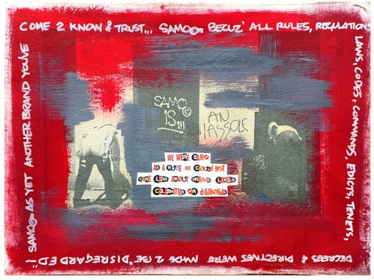 SAMO(C)とは「Same Old Shit(いつも同じくだらないもの)」の略であり、当時の主流文化、宗教、政治体制に対する冷笑的かつ反抗的な態度を内包していました。