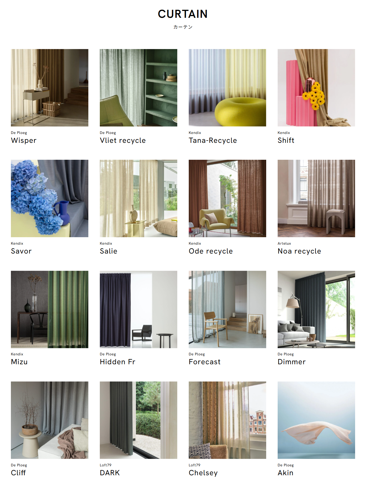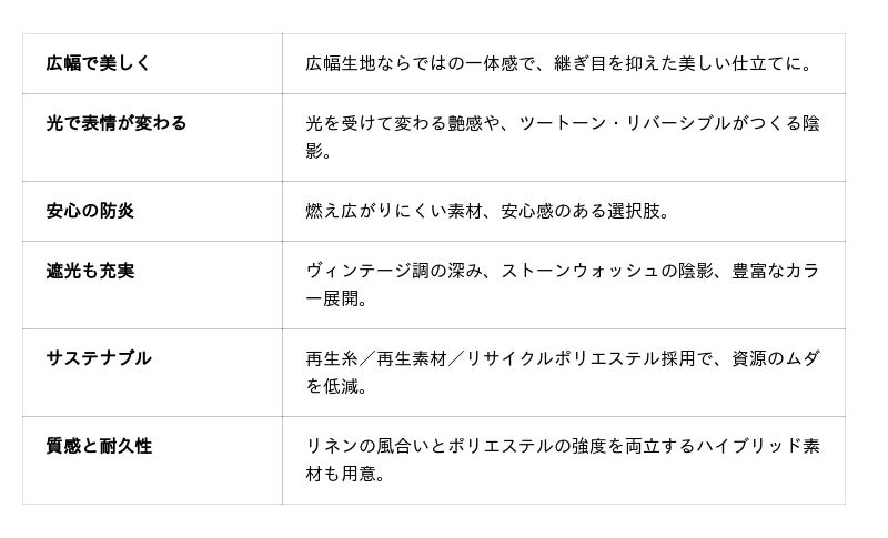 本コレクションは、広幅生地を中心に継ぎ目を抑えた美しい仕立てを追求し、美しいドレープを実現します。無地でありながら複数の色糸が溶け合う奥行き、光を受けて陰影が揺れるリバーシブル、全体にきらめきが走るシアーなど、光で表情が変わるファブリックを豊富にラインアップ。さらに、防炎(燃え広がりにくい素材)や遮光、ハイブリッド素材による美しさ(質感の良さ)と耐久性を兼ね備え、安心して選べる機能性も充実しています。加えて、再生糸・リサイクルポリエステルを用いたドレープ/レースも揃え、品質と意匠性に加え、サステナビリティにも配慮した窓辺提案を可能にします。