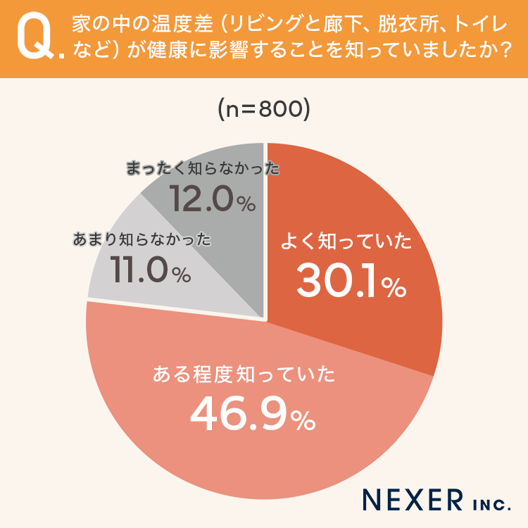 さらに、家の中の温度差(リビングと廊下、脱衣所、トイレなど)が健康に影響することを知っているか聞いてみました。