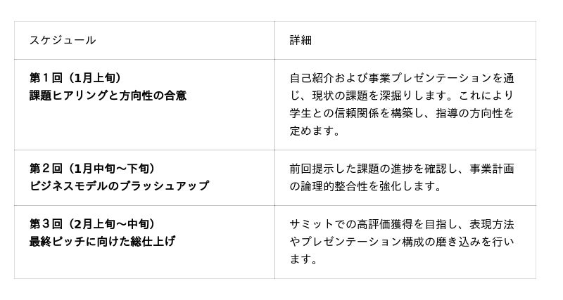本サミット本番に向け、全国から選抜された高専生チームがビジネスプランをブラッシュアップする過程において、技術的なフィードバックに加え、ビジネス視点での事業価値向上を目指したメンタリングを実施いたします。