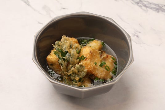 2025年春に実施した同市フェアで好評だった牛乳豆腐が復活。ダシの旨味を吸った揚げ出し豆腐は、口の中に入れた瞬間牛乳のまろやかさがふわっと広がり、とろけます。那須塩原産の春菊とチーズの素揚げも一緒にお楽しみください。