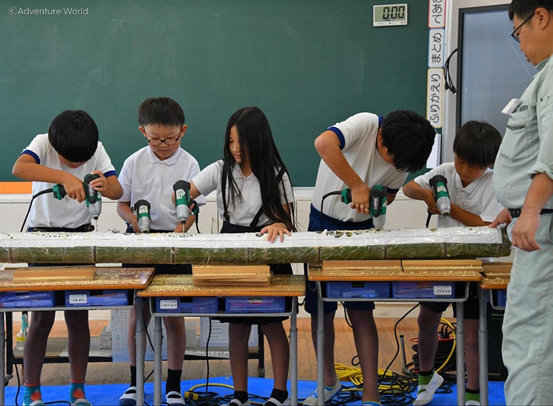 竹あかりを製作する小学生たち