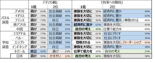 日本は子どもに「自分の考えをしっかり持ち、他人に迷惑をかけずに家族や友人を大切にする」といった『身近な人間関係』を大切にすることを期待していました。一方の他国は「家族を大切にし、社会のために尽くして経済的に豊かになる」といった『社会的・経済的な成功』を期待していることがわかりました。