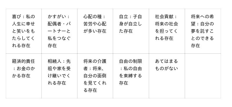 表1. 「あなたにとってお子様はどのような存在ですか」という質問の11の選択肢
