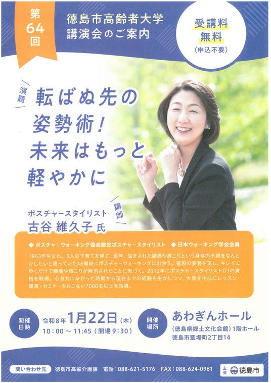 介護予防などに関する基本的な知識を普及啓発し、セルフマネジメントなどへの意識向上を図ることを目的として、つぎのとおり「第64回徳島市高齢者大学(講演会)」を開催します。