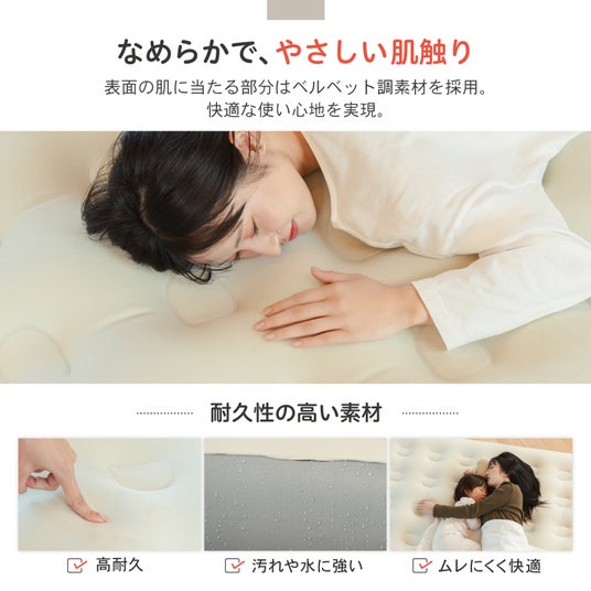 「エアーベッドは寝心地が悪いのでは?」という不安を払拭。厚みのある設計と、肌触りの良いベロア調素材が体を優しく支えます。 簡易的なマット エアー(エアーマット)とは一線を画すクオリティで、大切なお客様やご家族にも自信を持っておすすめできます。