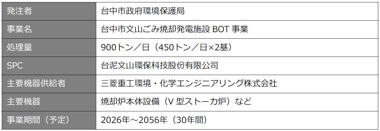 同SPCは、台湾最大手の廃棄物処理マネジメント会社である達和環保服務股份有限公司(Onyx Ta-Ho Environmental Services Co., Ltd.)と、同社の主要親会社で台湾最大手のセメント会社である臺灣水泥股份有限公司(TCC Group Holdings Co., Ltd.)の子会社の臺泥化學工業股份有限公司(TCC Chemical Corporation)の共同出資で設立されました。BOT事業の期間は30年間の予定です。
