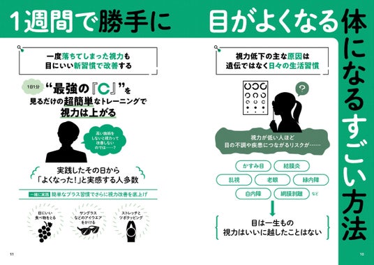 最大の目玉は、本書に付属している特殊な視力検査表『最強のC』です。 背景が黒のこの表を「見るだけ」で、なぜ驚くほど目が良くなるのか? 科学的な裏付けに基づいた、誰でも・どこでも・今日から始められる視力回復の極意を凝縮しました。