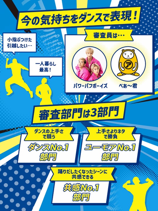 本コンテストは、新CMソングを使用したダンス動画をTikTokに投稿するだけで応募できる企画です。プロダンスチーム「パワーパフボーイズ」と、アパマンショップ公式キャラクター「べあ~君」が審査を担当し、ダンスの上手さだけでなく、ユーモアや共感性など、多様な表現を評価します。