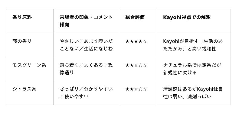 今回いただいたご意見や評価をひとつの指標としながら、Kayohiベーシックシリーズの処方思想を大切にしつつ、香りが日常にそっと寄り添うかたちで、今後の開発を進めてまいります。