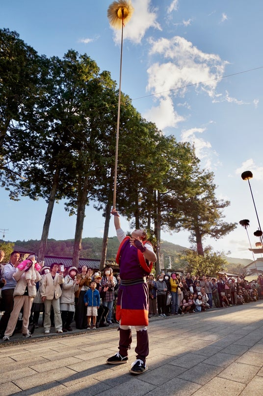 行列の中で一際目を引いたのが、先端に毛のある長~い棒・大鳥毛を持った「鳥毛・羽熊」の方々。長さ約5~6メートル、重さ5キロ超の大鳥毛を高く掲げたかと思うと、毛のある先端を観客の方へ傾け、頭上をなでていきます。これには人々の無病息災を祈る意味があるそうです。