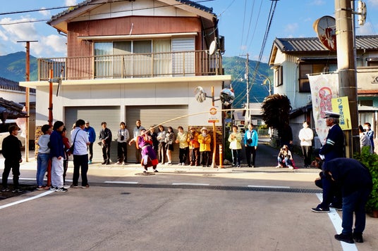 商店街から神社へ向かう曲がり角で、鳥毛・羽熊が見事なカーブを披露!