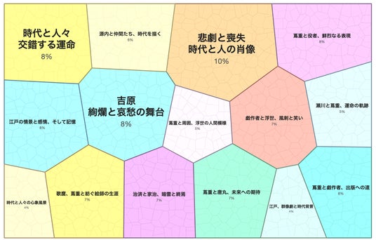 noteに投稿された感想文をAIで分析すると、そこには「悲劇と喪失 時代と人の肖像」「吉原 絢爛と哀愁の舞台」「時代と人々 交錯する運命」といった大きな物語の軸が浮かび上がりました。