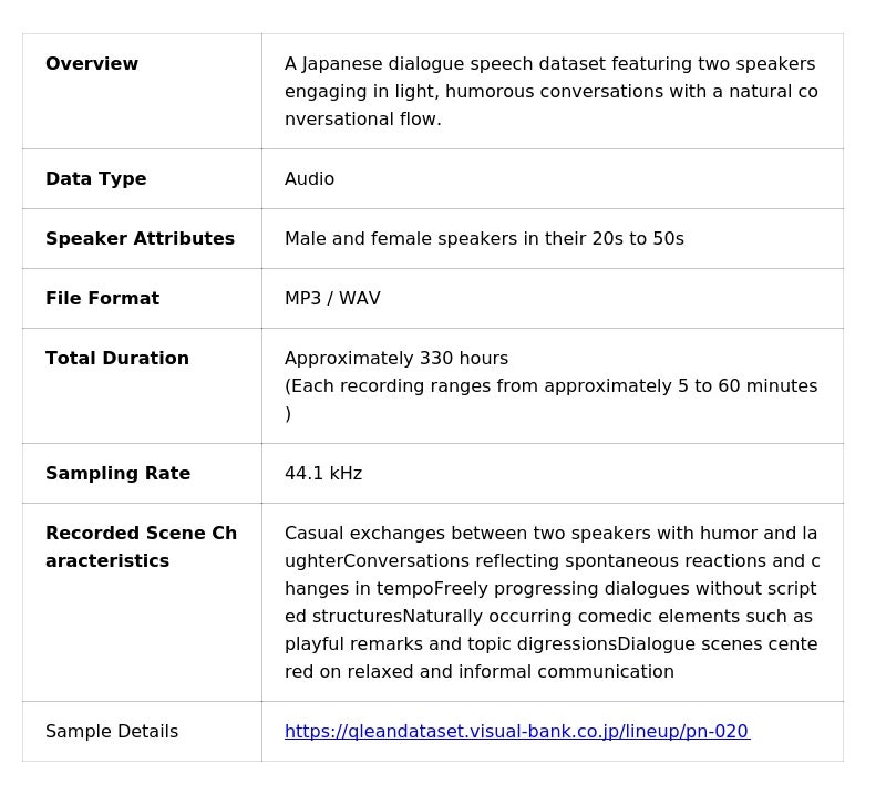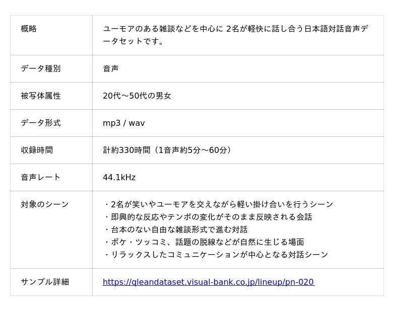 Visual Bank株式会社(東京都港区、代表取締役CEO 永井真之、以下「Visual Bank」)は、傘下の株式会社アマナイメージズを通じて展開するAI学習用データソリューション『Qlean Dataset(キュリンデータセット)』において、『日本語・2話者・コメディテーマトーク音声コーパスデータセット』の提供を開始しました。