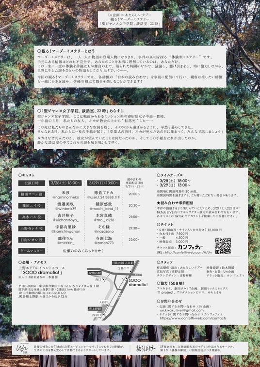 Un企画は、舞台俳優・声優などの表現者がライブ配信という“もう一つの舞台”で活躍する場を創出してきました。このたび、SF要素を含んだシナリオを得意とするマーダーミステリー制作サークルのあたらしいタブーとタッグを組み、『聖ジャンヌ女子学院、談話室、22時』を上演します。