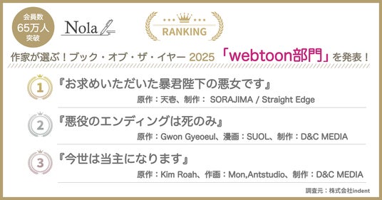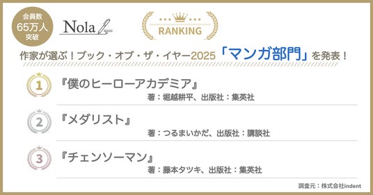 65万人を超える作家が登録する創作プラットフォーム「Nola(ノラ)」を運営する株式会社indent(本社:東京都千代田区、代表取締役社長:釜形 勇気、以下「indent)は、2025年12月2日(火)~12月14日(日)の期間、Nolaにご登録いただく作家の皆さまに向けて『読書事情にかんするアンケート』を実施し、小説・マンガ・webtoonの3部門に分けて『今年一番面白かった作品』を調査した結果を受け、このたび、『作家が選ぶ!ブック・オブ・ザ・イヤー2025』を発表いたしますことをお知らせいたします。