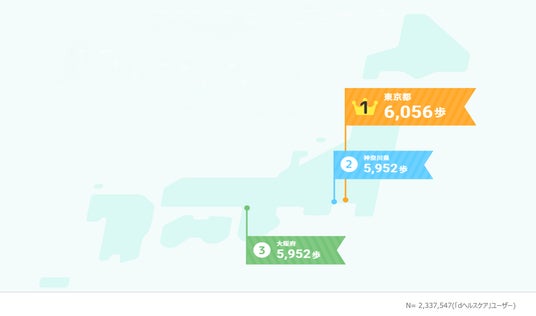 地域別では、東京都が6,056歩で最も高い結果に。都心部では交通インフラが発達している一方で、日常の移動距離が長く、通勤・買い物・余暇などの行動機会の中で自然と歩数が増える傾向が見られます。また、ウォーキングやランニングを日課にする層が多く、「健康意識の高さ」と「都市型ライフスタイル」が両立していることも、今回の結果を後押ししたと考えられます。