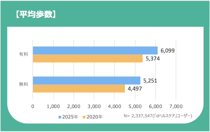 「dヘルスケア」では、有料・無料いずれのユーザーも歩数が増加傾向にあります。2025年のデータでは、有料版ユーザーが平均6,099歩、無料版ユーザーが5,251歩と、いずれも前回調査を上回り、無料版ユーザーでも歩数増加が見られました。