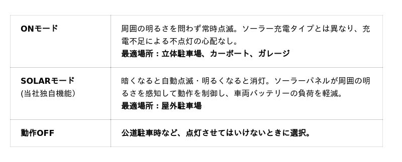 マンションや立体駐車場、ガレージなど日が当たらない場所でも使用可能。充電不要で高輝度点滅を維持します。