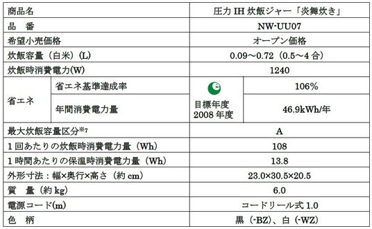 圧力IH炊飯ジャー「炎舞炊き」(NW-UU07)白(-WZ)