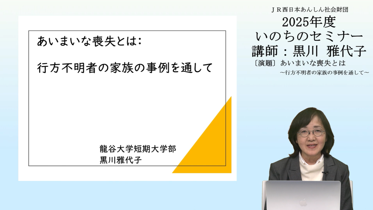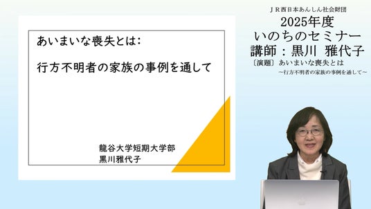 今年度第4回目の「いのちのセミナー」(WEB配信)は、龍谷大学短期大学部 教授の黒川 雅代子氏を講師にお迎えし、震災で行方不明となった方のご家族の事例を通じて、「さよならのない別れ」「別れのないさよなら」と言われる「あいまいな喪失(喪失した確証のない不確実な状態)」についてお話しいただきます。