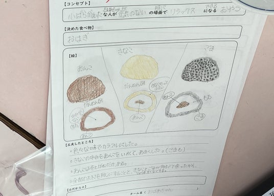 子どもたちは災害時という制約がある状況の中で、どのような人を、どのような場面で元気にしたいのかを考え、コンセプトに合うメニュー考案に挑戦しました。ターゲットとなる人にアンケートをとり、特徴やニーズをリサーチしてメニューづくりに反映させました。班の仲間と様々な案を出し合い、お米をうどんに変身させる、チョコレートと合わせるなど斬新なアイデアが多数見られました。
