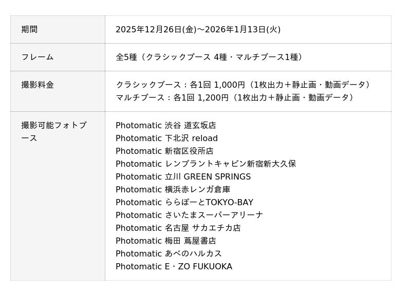 キタムラ・ホールディングス グループのピックハイブ株式会社(本社:東京都新宿区、代表取締役社長 兼 COO:大迫 由典)が運営するセルフフォトブランド「Photomatic(読み:フォトマティック)」は、2025年12月26日(金)から2026年1月13日(火)の期間中、大人気スクールアイドルプロジェクト『ラブライブ!サンシャイン!!』とのコラボレーションフレームをPhotomaticの全国12カ所のフォトブースで発売します。