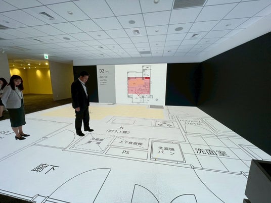 本サロンでは、3面LEDに実物大の外観や間取りを投影できるシステムを導入しております。これにより、該当物件のエントランスやエントランスホール、そして全タイプの間取りを実物大の迫力でご体感いただけます。