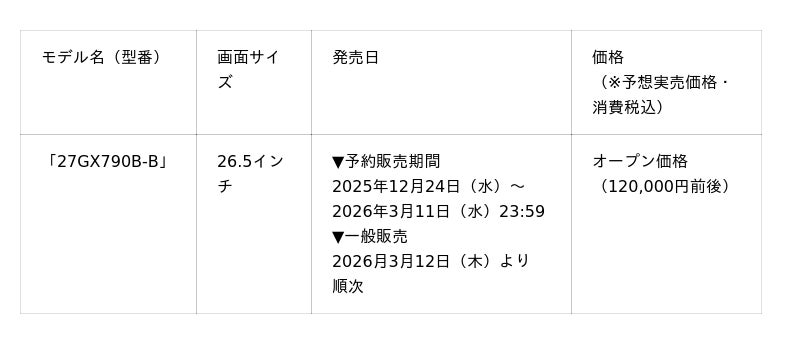 LGエレクトロニクス・ジャパン株式会社(代表取締役:孫 成周(ソン・ソンジュウ) 本社:東京都中央区)は、有機ELを採用したゲーミングモニター「LG UltraGear(TM) OLED」シリーズの新モデルとして、26.5インチWQHD(2560×1440)解像度の「27GX790B-B」の発売を決定し、本日2025年12月24日(水)から2026年3月11日(水)までLG公式オンラインショップで予約販売を開始します。予約販売期間中は特別価格で提供し、一般販売は2026年3月12日(木)より開始予定です。