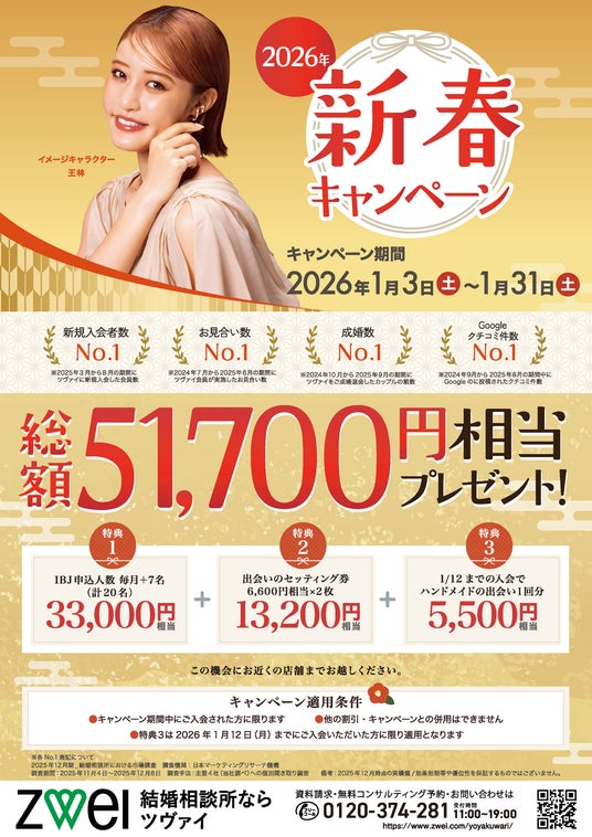 ZWEIでは皆様の2026年の婚活を応援するため、2026年1月3日(土)より「新春キャンペーン」を実施いたします。出会いのチャンスを更に増やす総額51,700円相当のオプションをプレゼント。