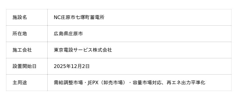 日本蓄電池株式会社(本社:東京都千代田区、代表取締役社長:漆原秀一)は、開発を進めているNC庄原市七塚町蓄電所(所在地:広島県庄原市)において系統用蓄電池の機器搬入を開始したことをお知らせいたします。
