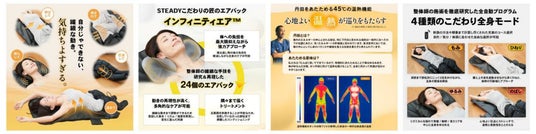 - 高機能エアバッグ「インフィニティエア(TM)」搭載 : 力強く高耐久なエアバッグが重さのある部位もしっかり支え、【もみ】・【押し広げ】・【圧迫】などの整体師の繊細な手技を再現した動きで全身ケアをサポート。エアバッグは1 年にわたって試作と試用を重ね、部位毎に細かく空気圧の強さ&角度を最適化しました。胸骨の下からゆっくり上半身を押し上げる動きから、首や頭を手で包み込むように支えて微細な揺らしやひねりで緊張を開放する動きまで、体の負担を軽減しながら全身に心地よく染みわたる刺激を届けます。温熱機能で体を温めながら全身にアプローチするため、短時間でも体の隅々までケアが行き届く【至極のストレッチ&リラクゼーション】を叶えます。