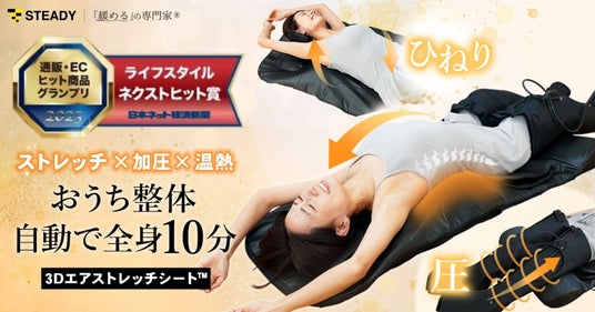 2018年のブランド展開開始から、SNSやカスタマーサポートで既存製品に対するお客様の声を拾い上げ、日本人の体格や考え方、住環境、ライフスタイルに配慮したホームフィットネス/ストレッチ製品を提案し、日本においてトップクラスのEC販売実績を誇る ステディジャパン 株式会社(本社:東京都新宿区、代表取締役CEO:森由樹)は、「STEADY 3Dエアストレッチシート」が『日本ネット経済新聞』の2025年ヒット商品特集において「ライフスタイル」カテゴリーの【ネクストヒット賞】を受賞したことをお知らせいたします。本製品は2025年4月の発売開始から予想を上回る反響を獲得し、ECモールでは想定の6倍の流通を記録しました。寝るだけで全身ケアができる「おうち整体」という新しいセルフケアのスタイルが、悪姿勢など体に悩みを持ちながらも整体等に通う時間がとれなかった方を中心に高い評価を得ています。
