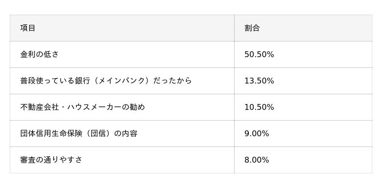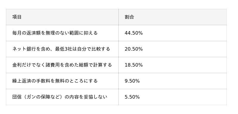 - 住宅ローン選びで最も重視されている点は「金利の低さ」が50.5%で最多。契約後の満足度は高く、56%が「後悔している点はない」と回答した。