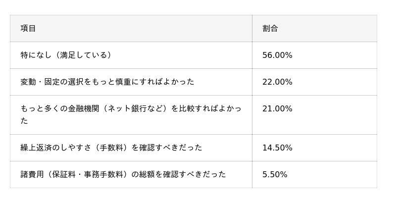 - 一方で、後悔がある人の理由としては「金利タイプの選択(変動・固定)」(22%)や「他行との比較不足」(21%)が上位に挙がった。