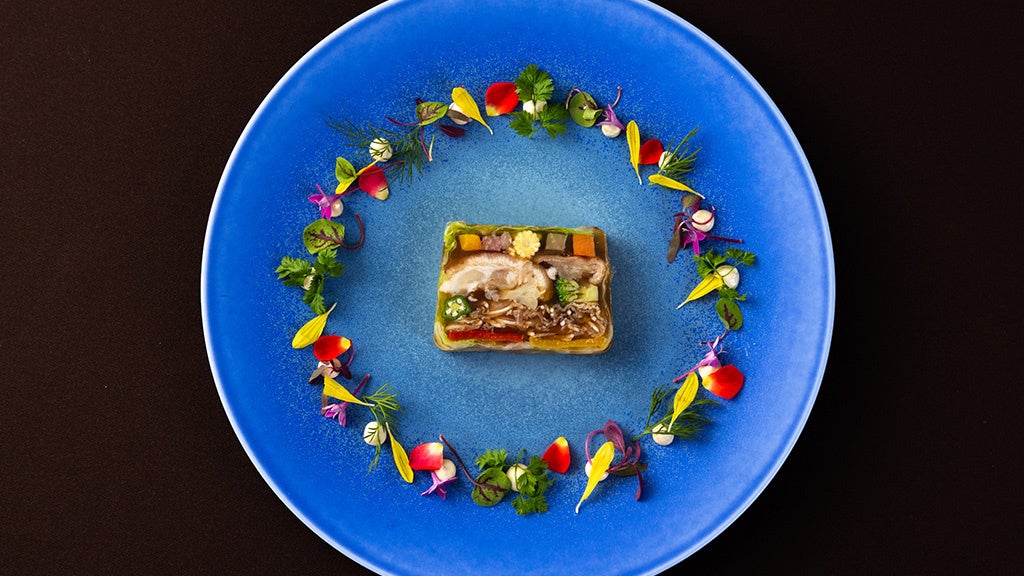 沖縄県産豚肉と野菜のゼリー寄せ シークヮーサー風味のマヨネーズソースにマイクロハーブのサラダ
