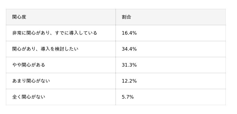 バイブコーディング(AIを活用したUI開発手法)への関心度を調査した結果、「すでに導入している」が16.4%、「導入を検討したい」が34.4%と、合計50.8%が高い関心を示していることが判明しました。